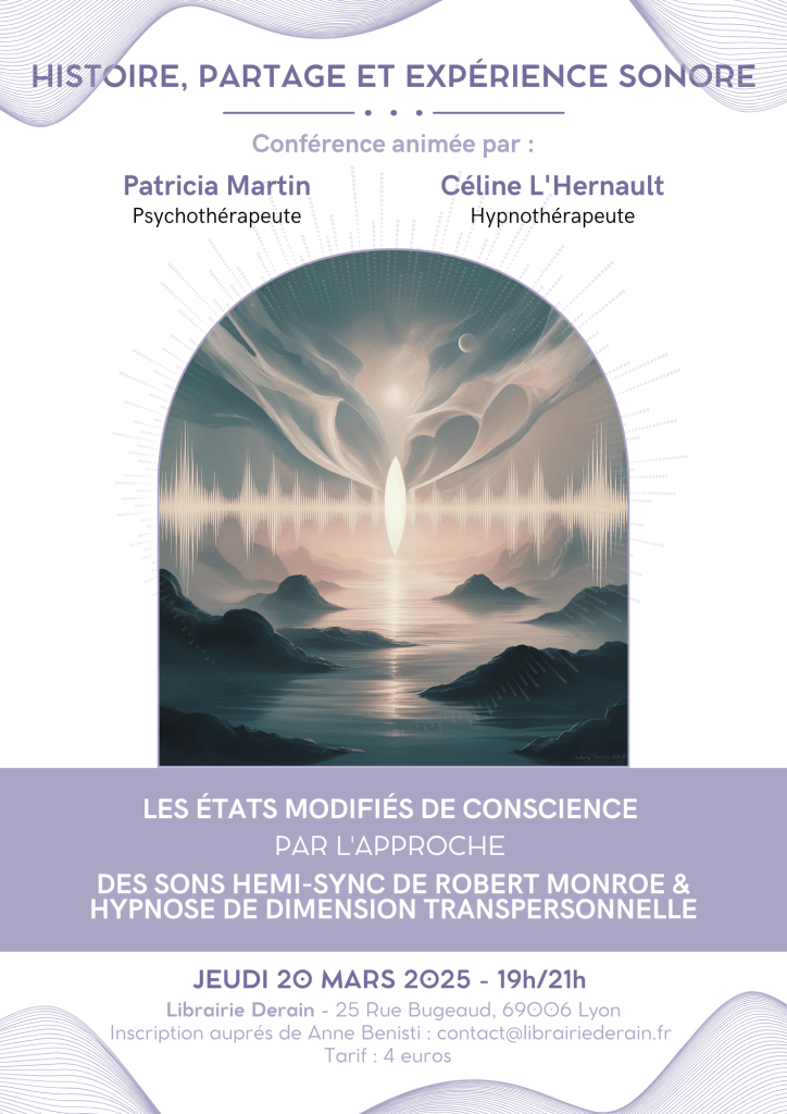 Animée par Patricia Martin Psychothérapeute, médecin, alcoologue et membre de L’Institut Monroe et Céline L’Hernault, IE biologiste moléculaire et Hypnothérapeute.