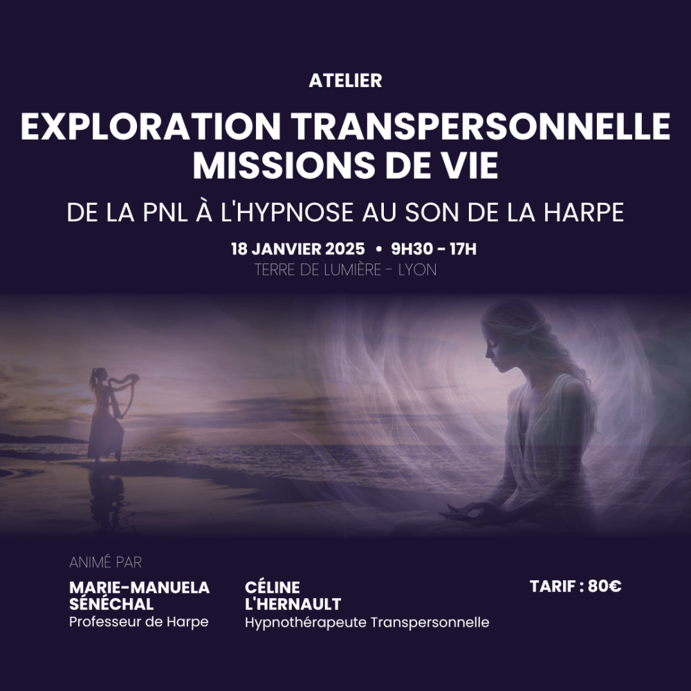 Atelier d’ Exploration transpersonnelle des missions de vie, De la PNL à l’Hypnose au son de la Harpe – Samedi 18 JANVIER 2025 – 9h30/17h