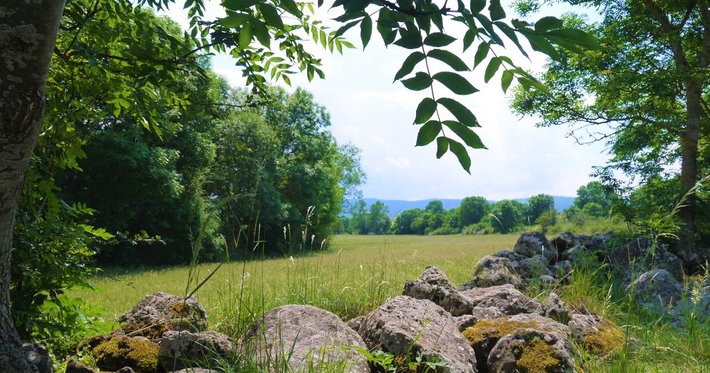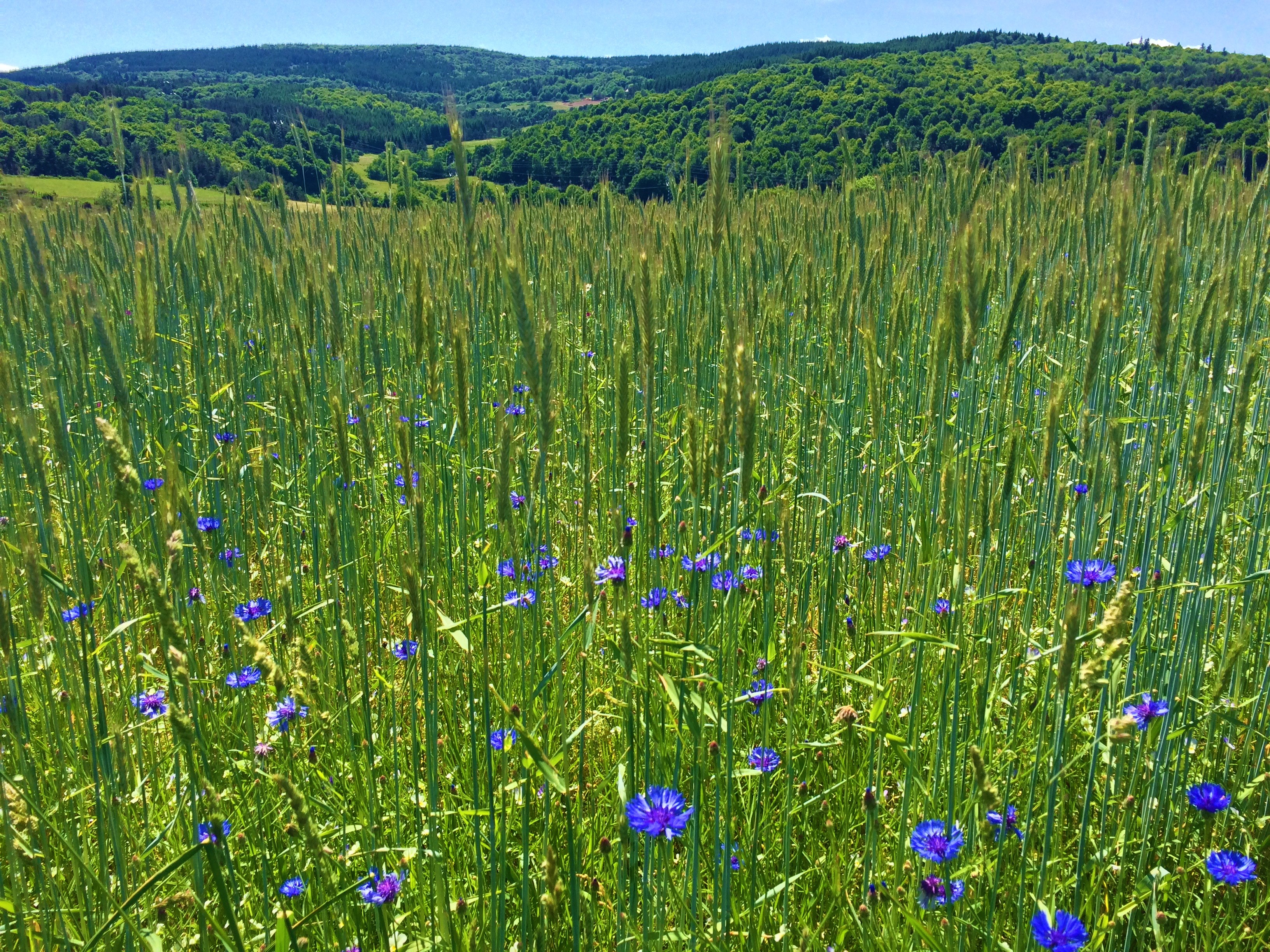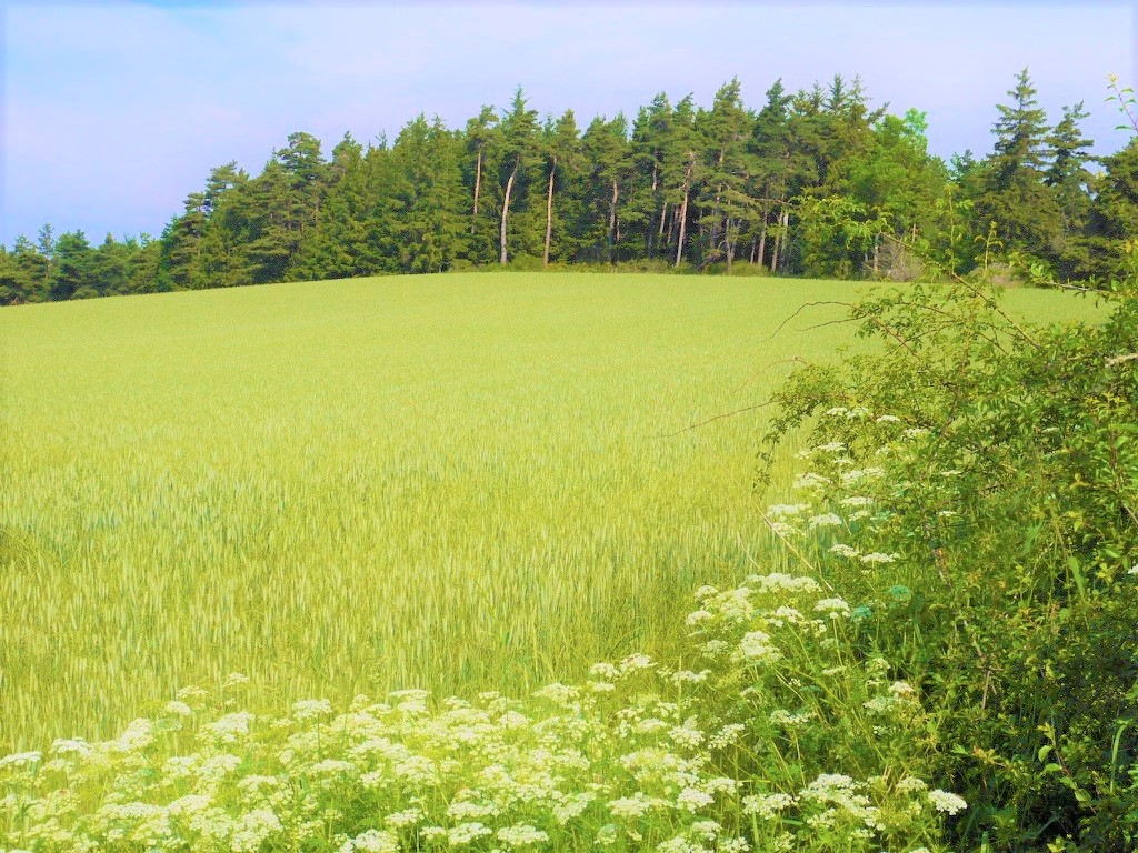 Au cours de ma marche, j’aime me poser au milieu d’un champ, à l’ombre d’un arbre, avec une vue sur le champ vert homogène qui ondule, sentir les odeurs fraiches, les fleurs des champs qui apportent des touches de gaieté par leurs couleurs et de la personnalité au paysage, souvent du bleu, du mauve et du violet. Je m’émerveille de l’association de ces couleurs « violette, bleu, indigo et vert ». Parfois du jaune aussi contraste avec le vert. Je savoure ce moment calme, de plénitude avec le doux concert des bruits d’insectes, ensoleillé, vivant, dynamique et profond à la fois.